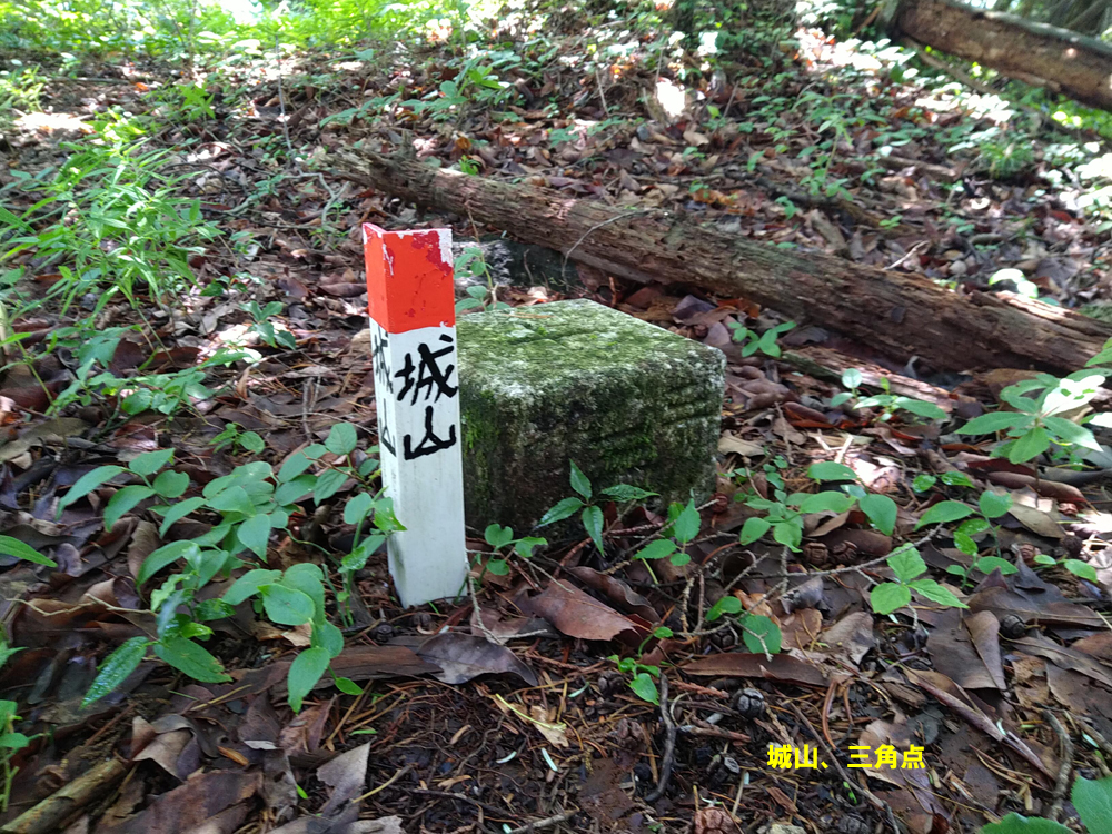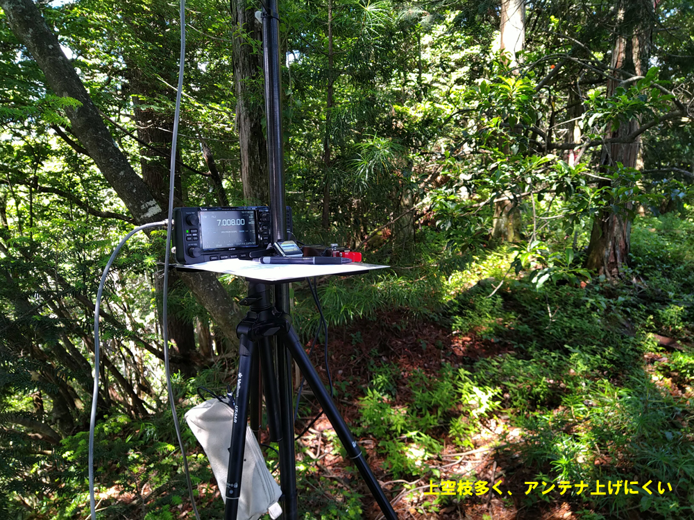 山頂周辺には、笹が生えており、露で濡れ、最後にはロープがかけられたところを登り切り、樹林で狭い山頂着。小さめの山頂標識が3つほど付けられ、少しは登られていそう。昼までに駐車地点に帰りたいのでモービルアンテナ2本で7MHzを短時間(約10分)電波を出して、下山開始。