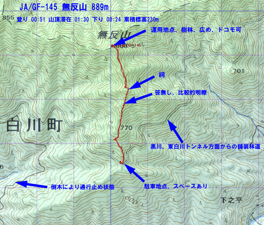 台風が近づき、天候不安定だが、この日は割と安定しているようなので南から無反山へ向かった。が、林道入り口に、最近よく出くわす工事通行止めの立て札。様子を見に近づいてみると作業員が3人おり、今現在は通行できるが、作業が始まったら不可との事で通ることができたものの、数百メートル走行した先に今度は、倒木が横たわっており、結局通行できず。すぐにUターンして東側のトンネル近くからある、林道を利用することに変更。草は所々ある物の通行には支障なく時間がかかったが、登山口に到着。軽く準備し登り始める。急坂であまり調子よくない。山頂到着後もボーとして手際よくアンテナ設営できなかった。久しぶりに7MHzと21MHzをワイヤーアンテナで運用、コンディションは良くなかったが、続けて呼んでもらえた。下山は土がフカフカなので、速いペースで降りることができもう一箇所行ってみることにした。