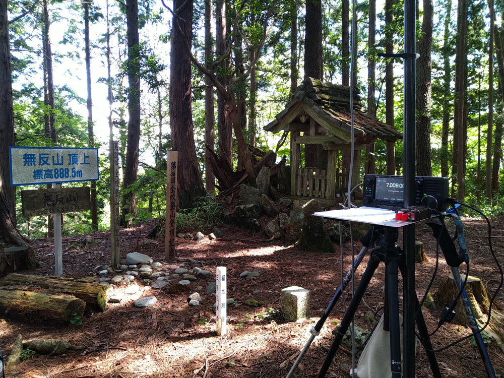 台風が近づき、天候不安定だが、この日は割と安定しているようなので南から無反山へ向かった。が、林道入り口に、最近よく出くわす工事通行止めの立て札。様子を見に近づいてみると作業員が3人おり、今現在は通行できるが、作業が始まったら不可との事で通ることができたものの、数百メートル走行した先に今度は、倒木が横たわっており、結局通行できず。すぐにUターンして東側のトンネル近くからある、林道を利用することに変更。草は所々ある物の通行には支障なく時間がかかったが、登山口に到着。軽く準備し登り始める。急坂であまり調子よくない。山頂到着後もボーとして手際よくアンテナ設営できなかった。久しぶりに7MHzと21MHzをワイヤーアンテナで運用、コンディションは良くなかったが、続けて呼んでもらえた。下山は土がフカフカなので、速いペースで降りることができもう一箇所行ってみることにした。