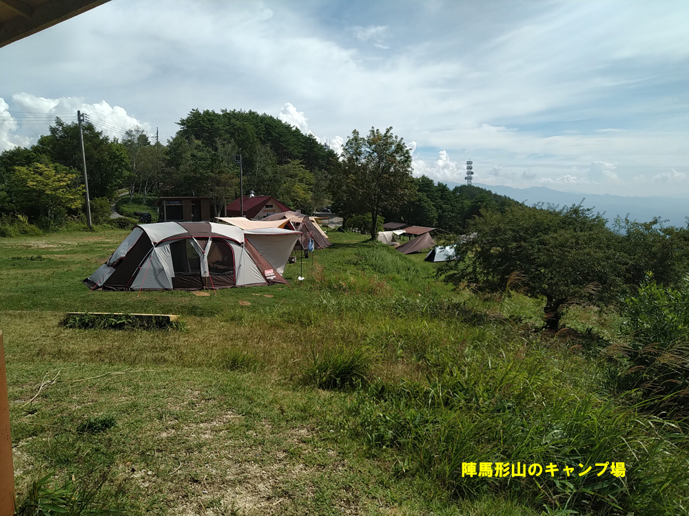 駐車場に到着してみると、以前より駐車場が移動し広くなっており、トイレも新しくなっていた。戸倉山のキャンプ場は無人だったが、こちらは、人気があり平日昼時で10張りほどのテントがあった。遊歩道をゆっくり歩き好展望の山頂着、今日は、中央、南アルプスの山頂部は霧の中だった。