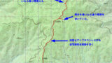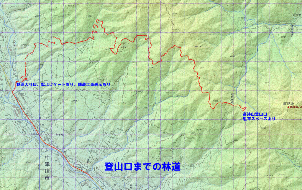 林道入り口に到着してみると、通行止めの表示と、ゲートが作られていたので思わず「これは中止だな」と思った。しかしよく見てみると最近よく作られている害獣対策のゲートと通行止めはただの工事では無いかと考え直し登山口案内も付けられていたのでゲートを開けて入ってみると、工事はこの林道を舗装するためで今日は工事を行っていないようだ。