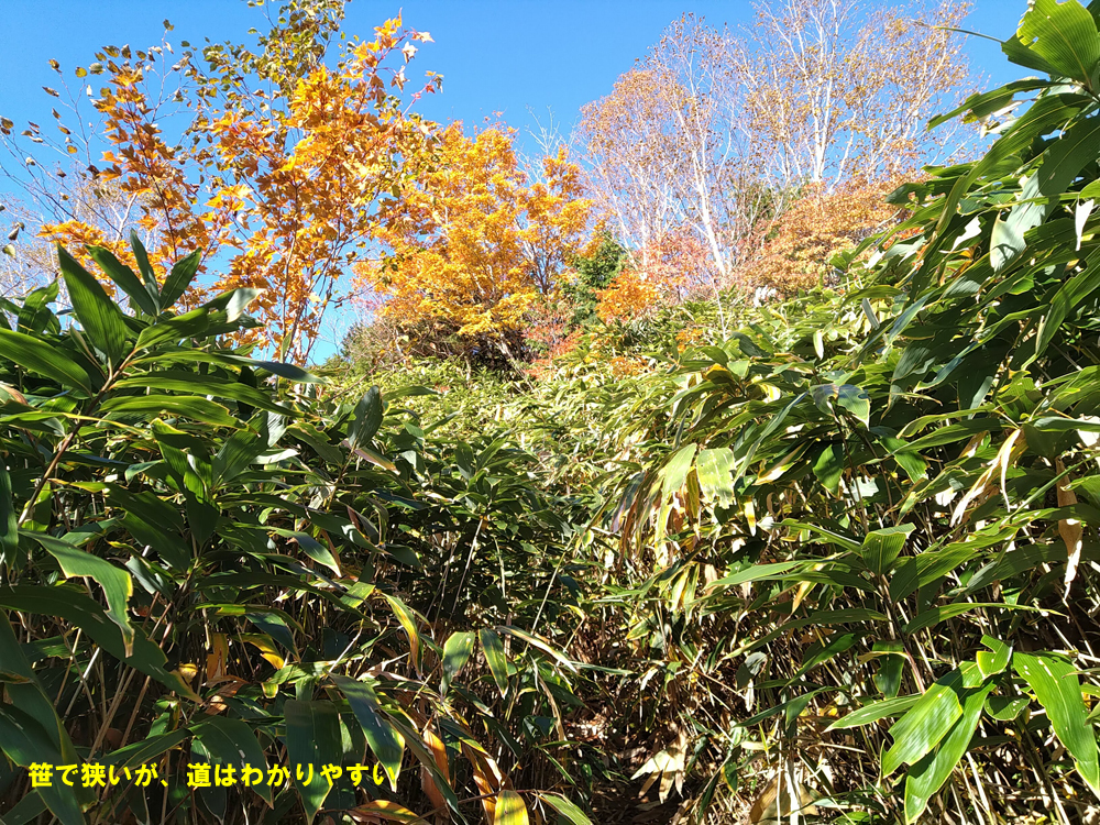 途中、笹で狭くなっているところもあったが、今回も笹に露がほとんど乗っておらずベタベタにならずに済み、上部に来ると樹林になり、道幅が広くなりそのまま頂上と思いきや、頂上直下は再び笹との触れあい。