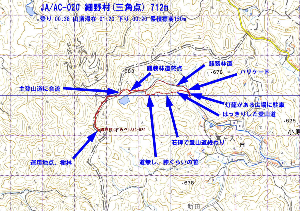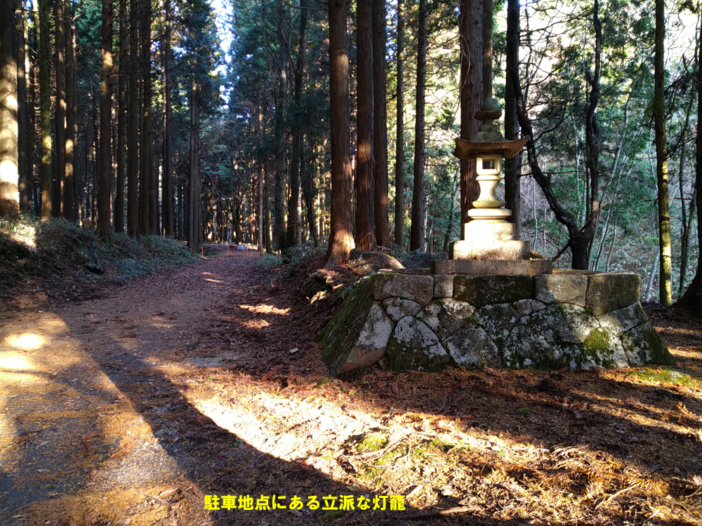 登山口までは細めの舗装路、バリケードになっている灯籠のところまで車で入り路側に駐車しました。林道の他にはっきりした登山道が山頂方向に伸びていたのでそちらの急坂を登ってみると小ピークの石碑のところで止まっており、来た道を戻るのも面倒なので、道が無い膝ほどある笹の中を適当にピークを下り正規の林道に合流することができました。
