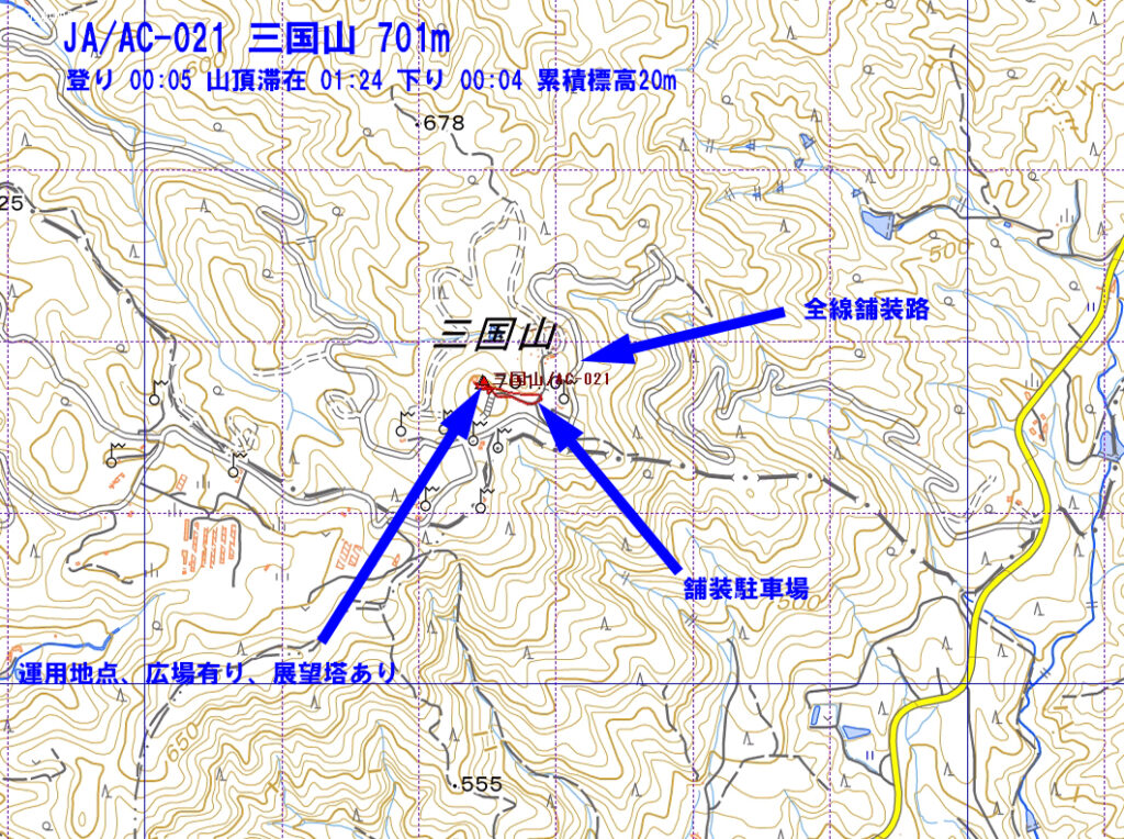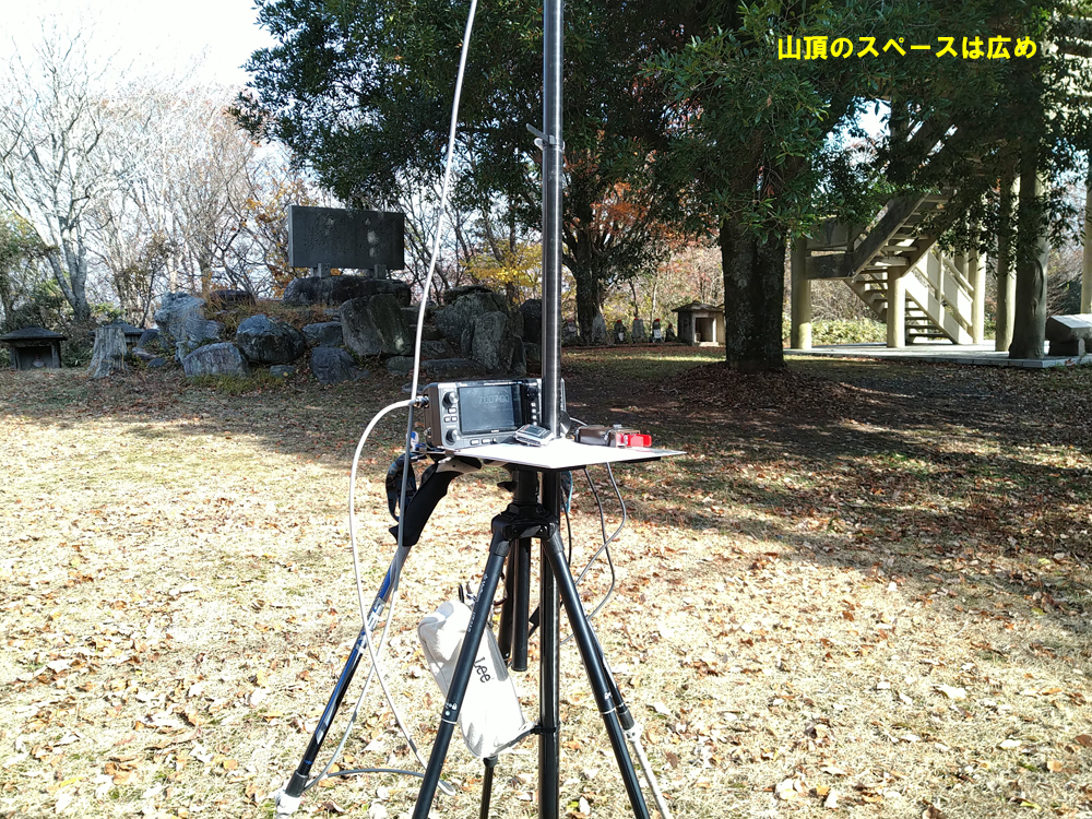 細い道だが、山頂近くまで舗装路が上がっているので、展望塔がある山頂までは、数分の徒歩で到着。展望塔下に広場があるので、そこの隅にアンテナを張り7MHz運用。下山は違う方向の舗装路を車で通ってみましたが、こちらも問題なく通行できました。