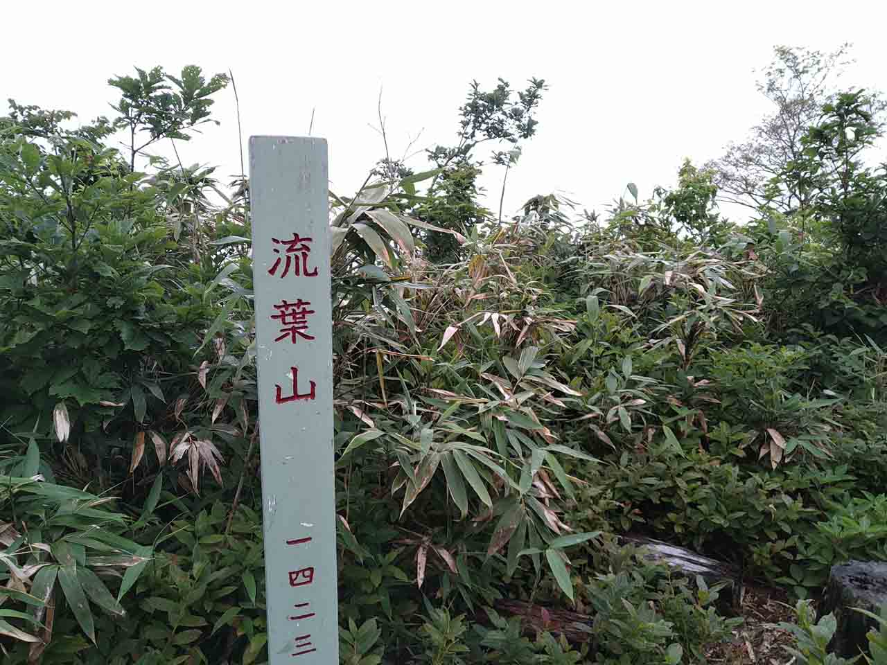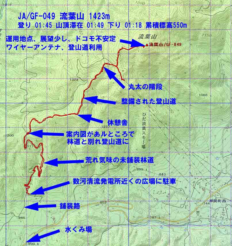 快適な気温の中、荒れ気味の未舗装路を歩いていくと、雲の上水源の森コースという案内と地図が設置してありそこから林道と別れ登山道に入った。尾根道をアップダウンしながら徐々に高度を上げ、丸太でできた階段を上るとひだ流葉スキー場の上部に出た。リフト一本分登るとほとんど登ることなく流葉山山頂に道は続いていた。藪気味というネット情報もあったが、先月トレイルランニングの行事が行われたからか、笹は刈られ、道幅が広くなっていた。山頂からの展望はほとんど無く、すぐにブヨが顔の周りに集まってきたので、ネットをかぶって無線の準備、今回はかなりこれの効果を感じ快適であった。