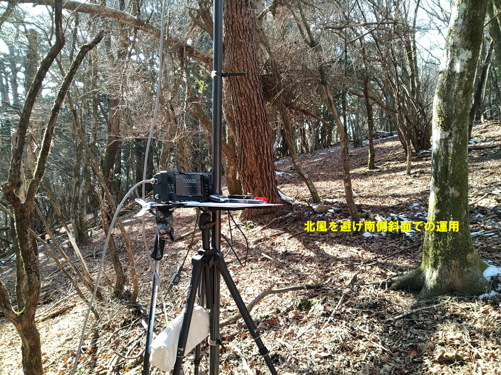 反射板にも行ってみたが、風が強いので樹林の尾根を南方向に少し降りた上空スペースがあるところで無風が得られ、モービルアンテナ2本で7MHz運用。