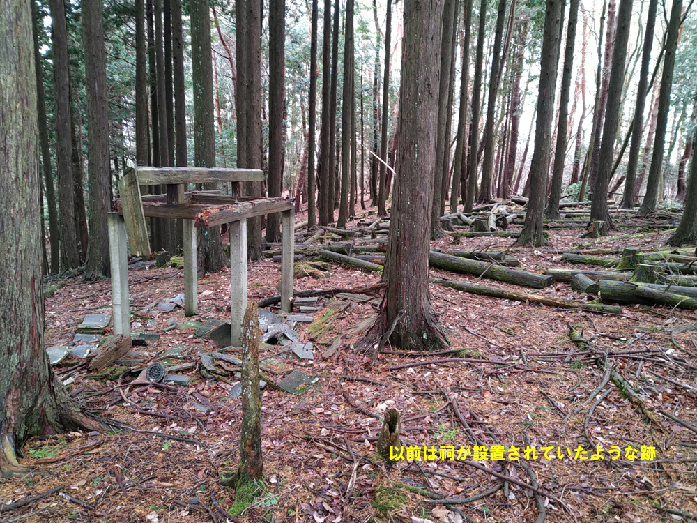 林道は、目的地方向に向かっていたのでそのまま終点まで歩き、早めに尾根に乗ろうと適当に斜面を登っていったら遠回りになってしまった。気を取り直して、尾根からの下山地点を考えながら進み、樹林の以前は祠があったような木組みがある山頂着。樹間は広めでアンテナは張りやすい。
