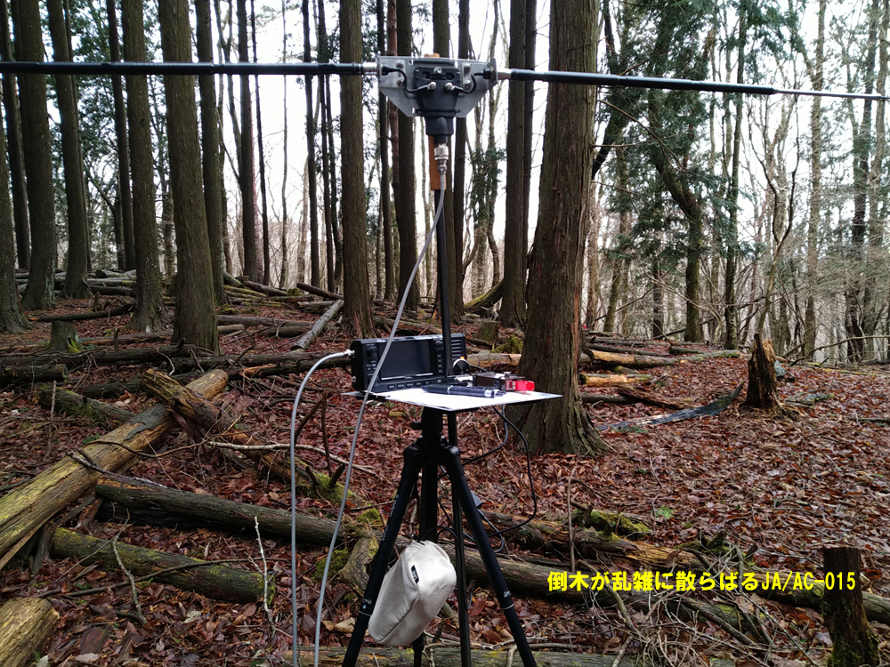 霧雨の中、短めに7MHz運用して下山に入るが、適当に歩いていたら違う尾根上を歩いていた。が、あと林道終点まで100mほどのこともあり道なき急坂を倒木を乗り越えながら歩き、林道合流できました。