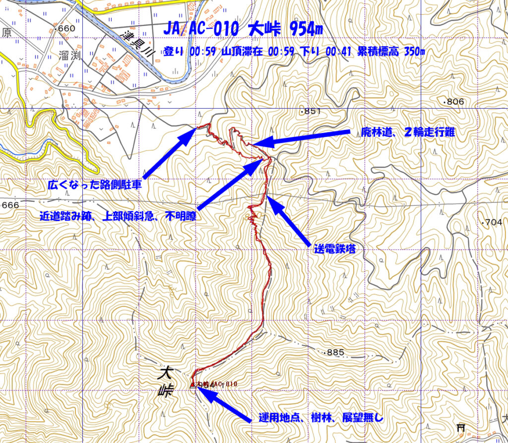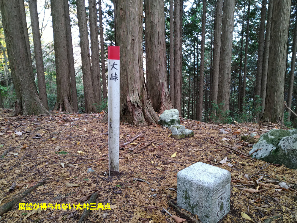 最初は谷を順調に歩くことができたが、だんだん傾斜が強くなりしかも踏み跡がなくなり慎重に歩いて林道に再合流できた。途中鉄塔巡視路を使い尾根を登り、細長い山頂部の一番奥にある大峠三角点着