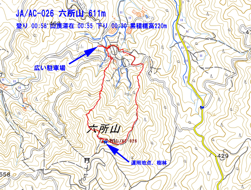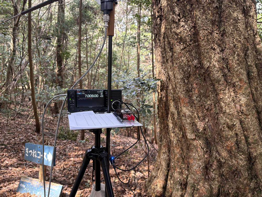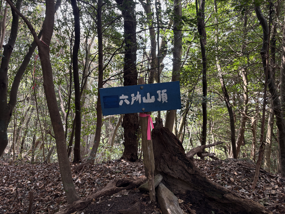 炮烙山から、予想より早く下山できたので、細い道を車でキャンプ場などいろいろな施設がある六所山広い駐車場まで移動した。たくさんの分かれ道があるので、登山道がどの道か迷うところもあったが登山道に入ってしまえばそれもなく快適に歩くことができた。山頂は下界の施設とは違い、樹林で展望なく山頂標識もかなり控えめ、大木のそばでここでも7MHZ運用を短めに行い、周遊している道で下山