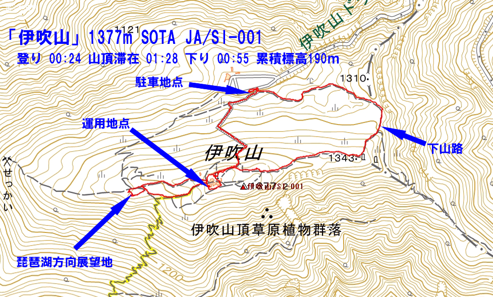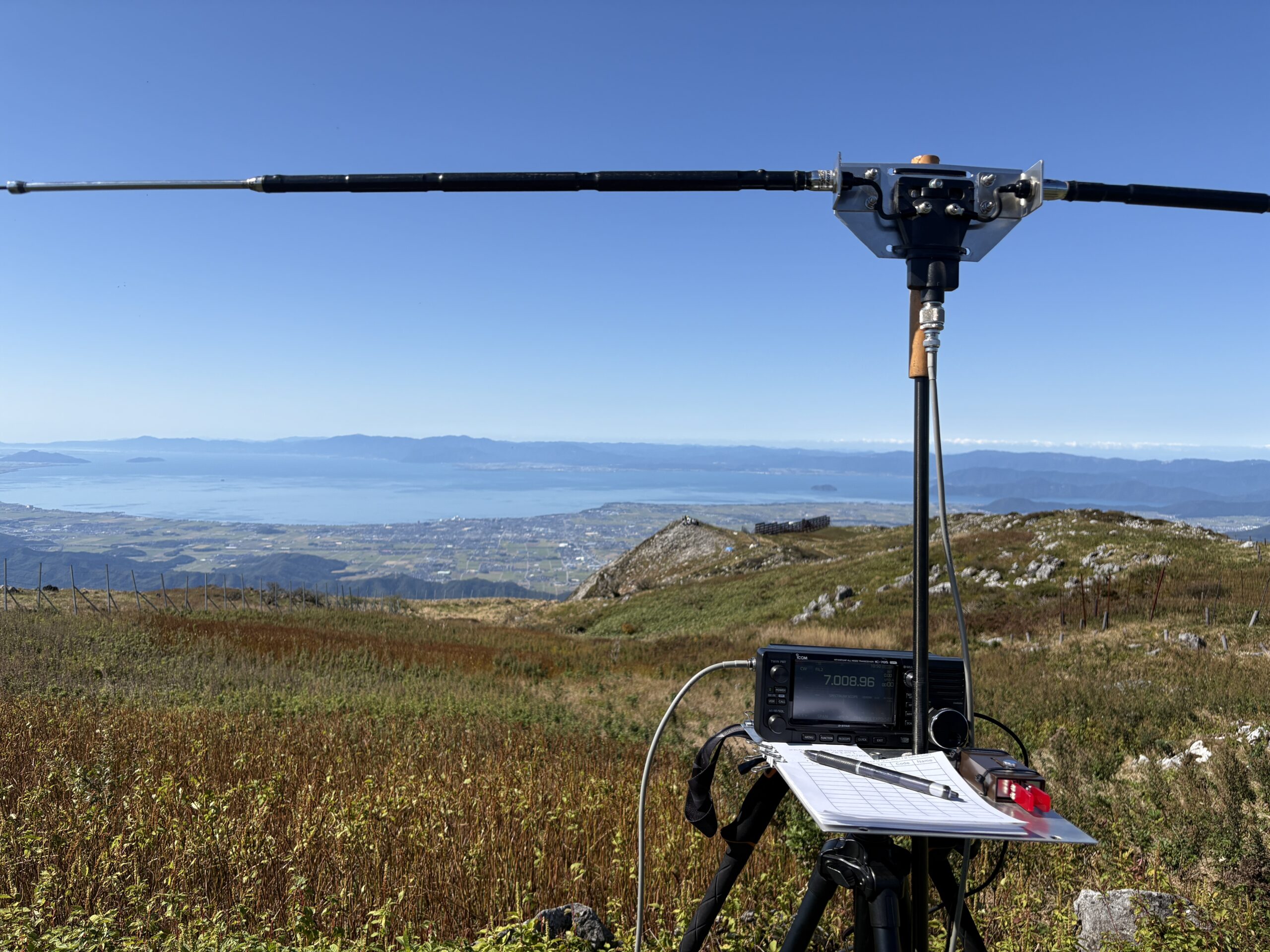 西登山道は整備のため通行止めだったので一番山頂に近い中央の道で山頂に行き、ひと気が少ない琵琶湖が眺められるところで無線運用、2ヶ月ぶりで運用状態を知らせるウエブサイトのログイン情報を忘れており、しばらく7MHzでCQを出していたら、1局呼んでくれ、その後その人が運用情報をスポットをしてくれたためか空振りだったCQが突然同時に数局呼んでくれるようになった。