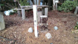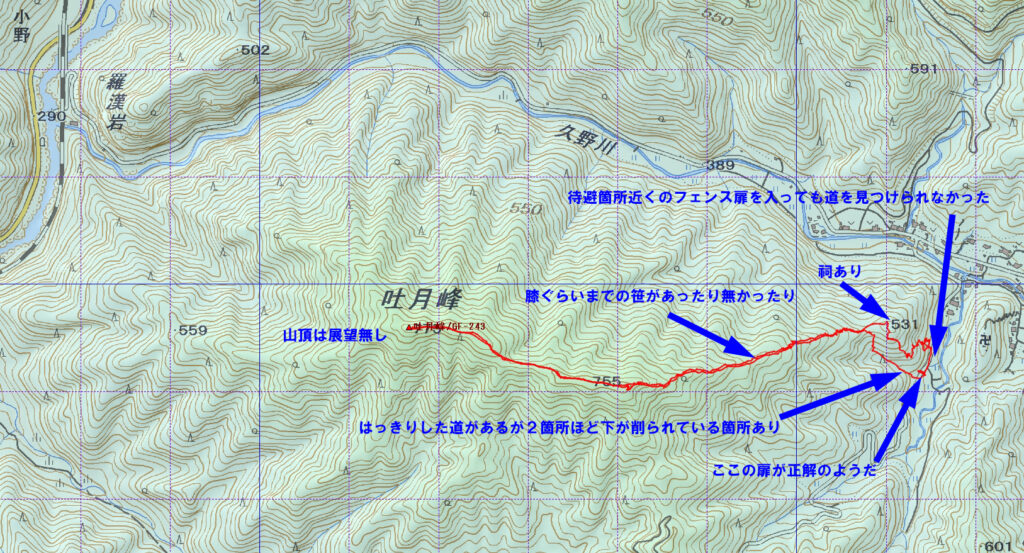 寒くなってきたので、少し標高を下げて、行ったことが無い吐月峰に向かった。待避箇所に車を駐めるとすぐ上に害獣フェンスの出入り口が見えたのでそこから入山してみると道らしき道が見つからず。適当に標高を上げながら道を探すが見つからず。急坂をひとまず531ピークに行ってみることにした。到着してみると祠があり、その後は尾根上に吐月峰に向かい踏み跡が続いていた。膝ぐらいまでの笹があり、昨日の雨で濡れていてもあらかじめレインウエアの下を着ていたので問題なく歩くことができた。