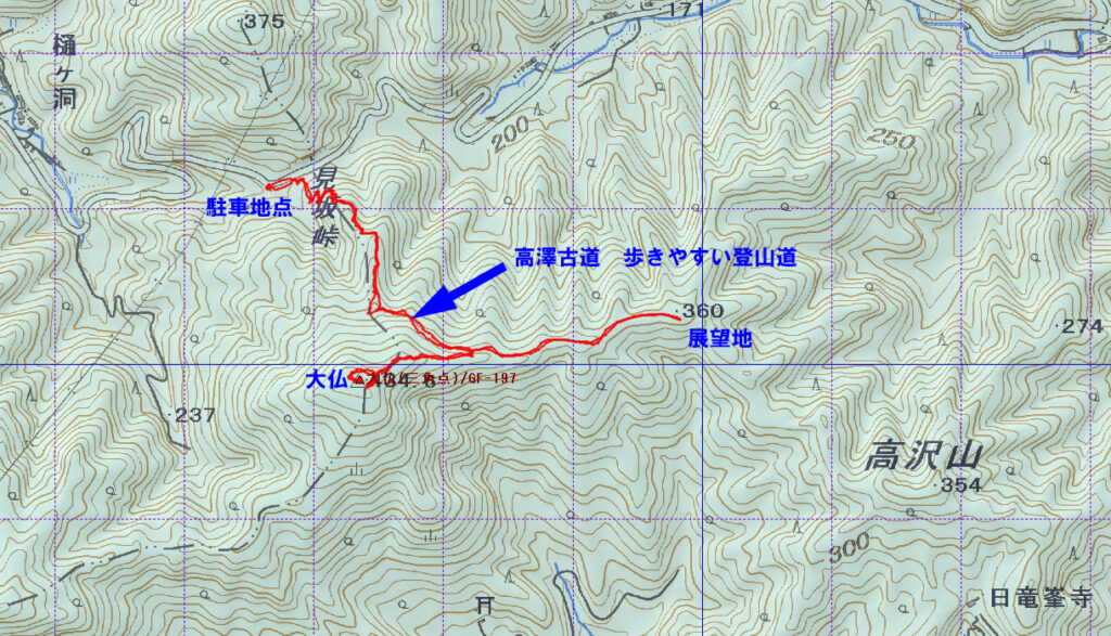グーグルのストリートビューで登山口らしきところが見つかったので歩いてみることに、道なき道も覚悟していたが、高澤古道という歴史ある道で倒木が数カ所あるものの道自体は整備され歩きやすいところでした。