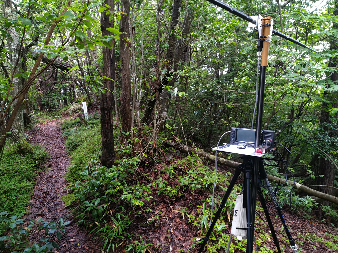 頂上直下の急坂は蒸し暑さで汗だくになり、山頂到着もかなり草が生えておりワイヤーアンテナをあきらめ、樹林に入りモービルアンテナ2本で7MHz運用。20局交信できたので、下山開始、東コースも急坂だが西より歩きやすいと感じました。ただ隠れた木の根、岩などで、スリップ、転倒数回、ブヨにもまとわりつかれ、蒸し暑さもあり不快でした。