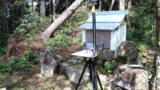 以前地元の人に聞いた話だと「峠を越えて隣の集落まで行っていた」との事なので道はあるかもと思い砂防ダムのあるとこから入山してみるとそこに道は無く、ひとまず適当に植林地の急斜面を主尾根の鞍部まで登ってみることにしました。尾根に出ると踏み跡がありそのそれを辿って行きましが、途中で大岩を巻くところがあり行き帰りで南北を歩いてみましたが、南側の方がどちらかというと安全なような気がしました。その後も急斜面が続きましたが、なんとか山頂の一角に到達し三角点を探したら、ブッシュに囲まれるように置かれていました。少し戻り上空が開けた平坦な所を探し、昨日7MHz良くなかったようなので早めに7MHz運用、その後18MHzに移り運用終了。