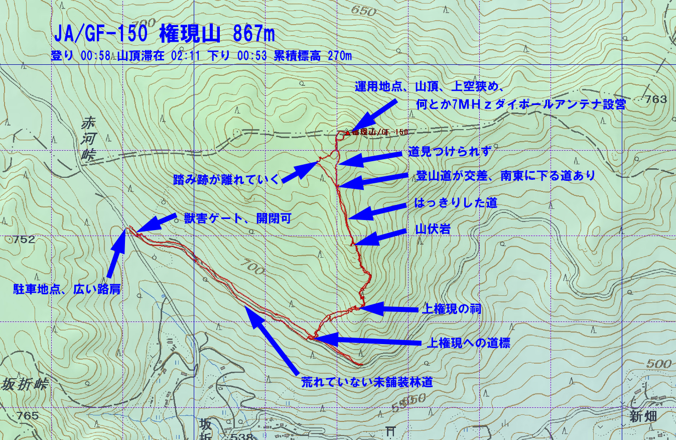 踏み跡通りに歩いていると目的地が遠くなっていったので、途中から踏み跡がないところを直接山頂に向かって歩き山頂着。そこは北風が吹きすさんでおり、南側に少し降りたところでアンテナ設営、21MHz、18MHzと運用し7MHz運用に入ったところで雪がひどくなり無線機にも積もり始めたので運用を中止して下山しました。