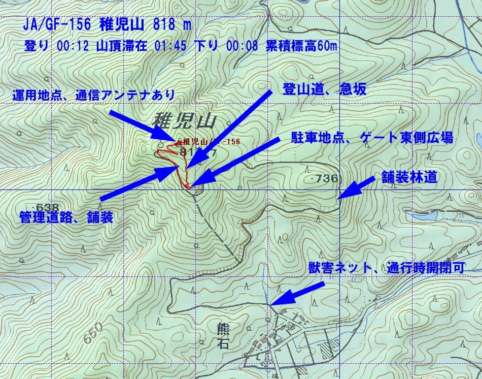 先にJA/GF-164 750mを歩いてきたので、稚児山が後回しになり、最初はできるだけ下から歩こうと思っていたましが、獣害ネットを通過し舗装路を走ってみると、意外と走りやすいのでどんどん登ってしまい山頂直下の鉄製ゲートまで来てしまいました。駐車スペースもあるのでここから、意外と急な登山道を少し歩き通信アンテナが複数と祠がある山頂に到着しました。