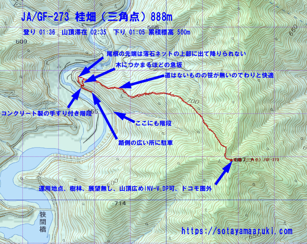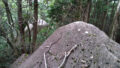 落石ネットの切れ目にコンクリート製の階段が2箇所あり、尾根の先端に近い方の樹木に覆われかけた階段を登ると、特に道らしいところはなく適当に傾斜がきついので木をつかみながら尾根まで上がりました。そこからは道はないものの歩ける状態になっていたので、尾根を外さないように歩きました。