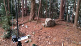 落石ネットの切れ目にコンクリート製の階段が2箇所あり、尾根の先端に近い方の樹木に覆われかけた階段を登ると、特に道らしいところはなく適当に傾斜がきついので木をつかみながら尾根まで上がりました。そこからは道はないものの歩ける状態になっていたので、尾根を外さないように歩きました。