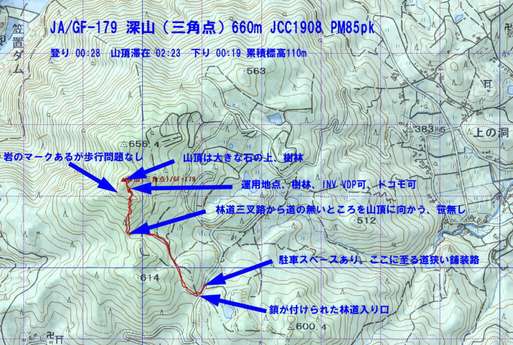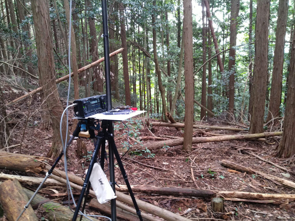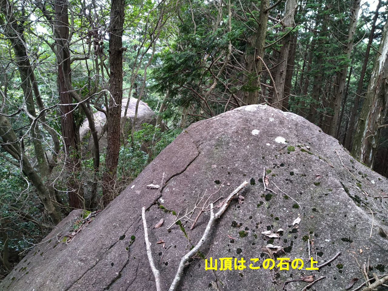 笹が無いので適当に歩きやすいところを、蜘蛛の巣を避けながら登って行った。直下に岩がある記述が地図にあったので崖かと思ったら大きな石があるだけで歩行に支障なし。山頂は大きな石の上にあったので少し降りたところの樹林の中で7,21,18,50MHz無線運用、18,50MHzはCQ空振り