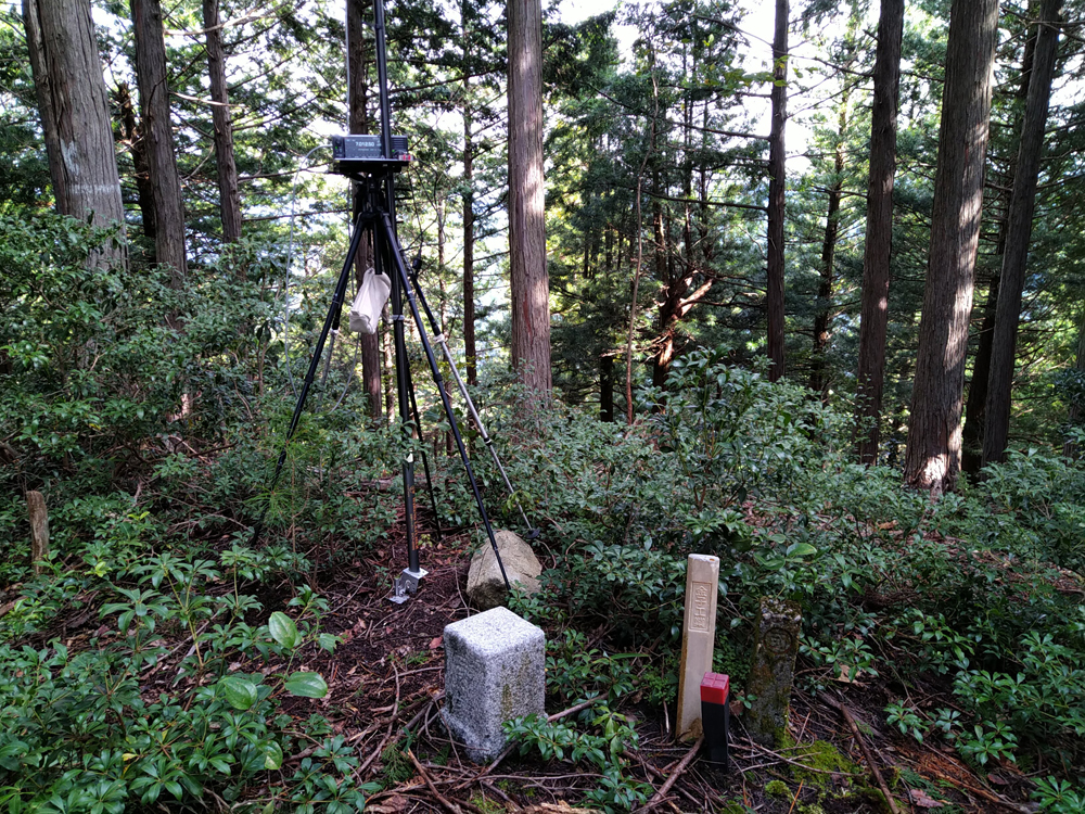 林道に従って歩いているとだんだん谷から離れていくので引き返し、荒れた方の林道に入り直し。倒木が2箇所ほどあったり、草がたくさん生えてオフロードオートバイでも無理そうな廃林道を歩いて行くと、またもや谷を渡り反対方向に道が向かい始めたので、引き返し道がはっきりしない植林の中を山頂に向かって歩くことにした。笹が無いのでありがたい。途中から尾根に乗ってみると、うっすらと踏み跡、時々テープが現れそれは山頂まで続いていました。