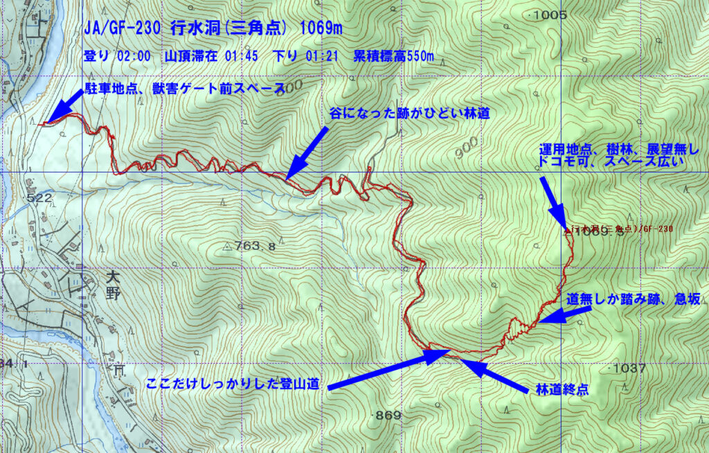 山頂は樹間が広くなだらかなところで、ワイヤーアンテナ張りやすい場所でした。7、21、14MHz3バンド運用。