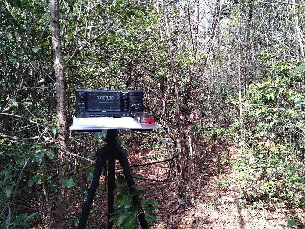 上空も枝が多く、モービルアンテナ2本でも枝に引っかかりながらの設営となりました。前回運用中にSWRが3近くまで上昇し、どうしようかと思いましたが、今回は樹木が近いにもかかわらず、1.5以下で安定しており一安心。