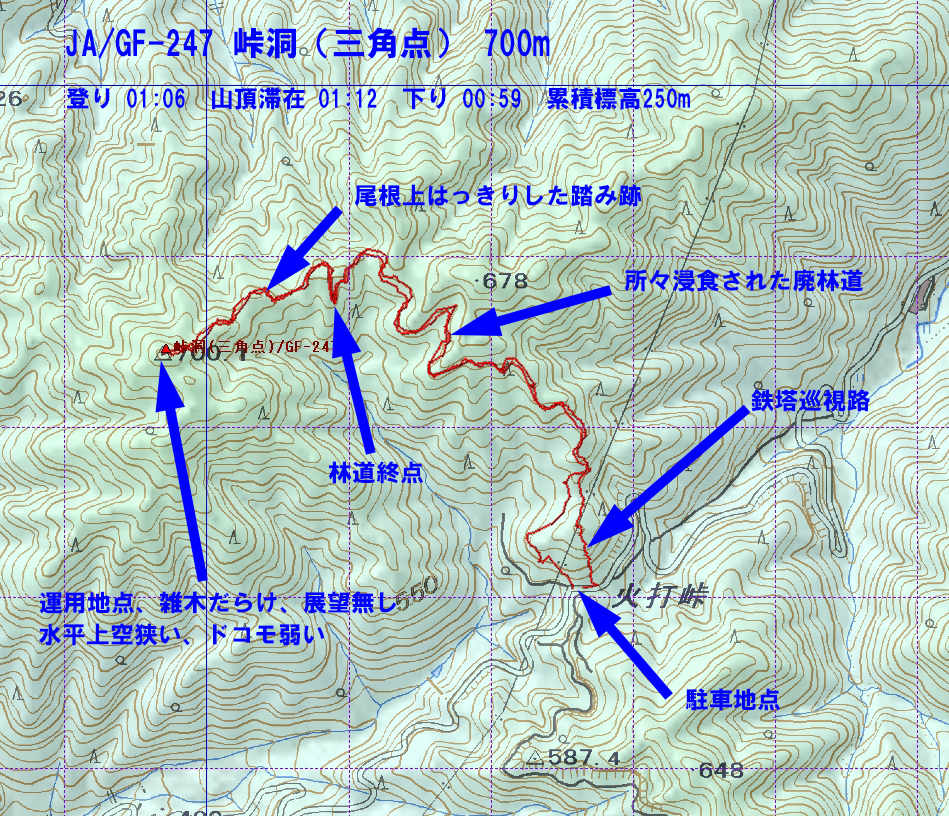 スペースがないので7MHzのみで終了し来た道を下山。舗装路に近づいたところで送電鉄塔を経由して歩いてみると、ここにもはっきりした入り口がありました。