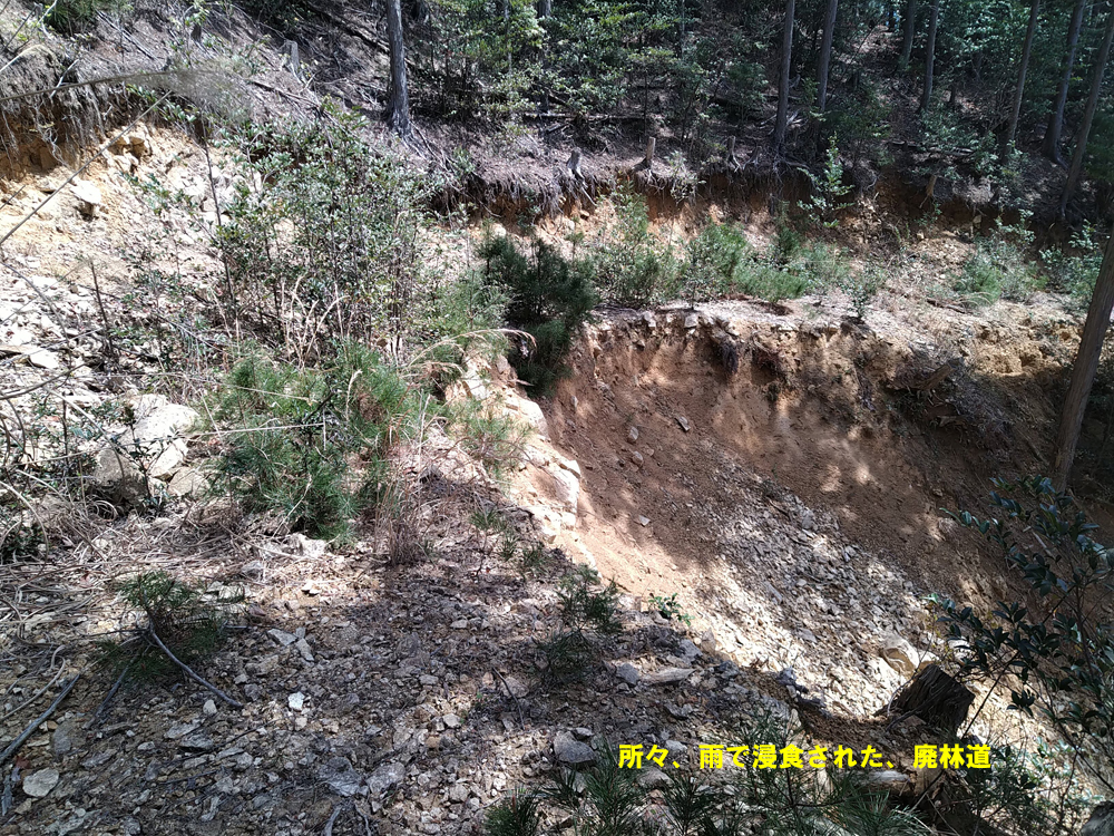 2年半前は草ボーボーで入り口が見つけられず、入れそうにありませんでしたが、昨年行った方のブログには、道があったとかいてあるので、登山口である火打峠に行ってみると確かにはっきりした入り口があり、歩いてみると、その道は廃林道になり、途中雨で崩れたところもありましたが、道は目的地方向に伸びており山頂約300m近くまで林道で接近することができました。
