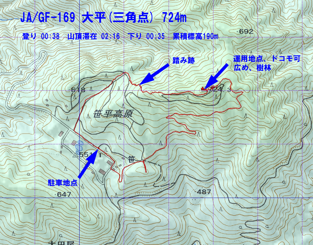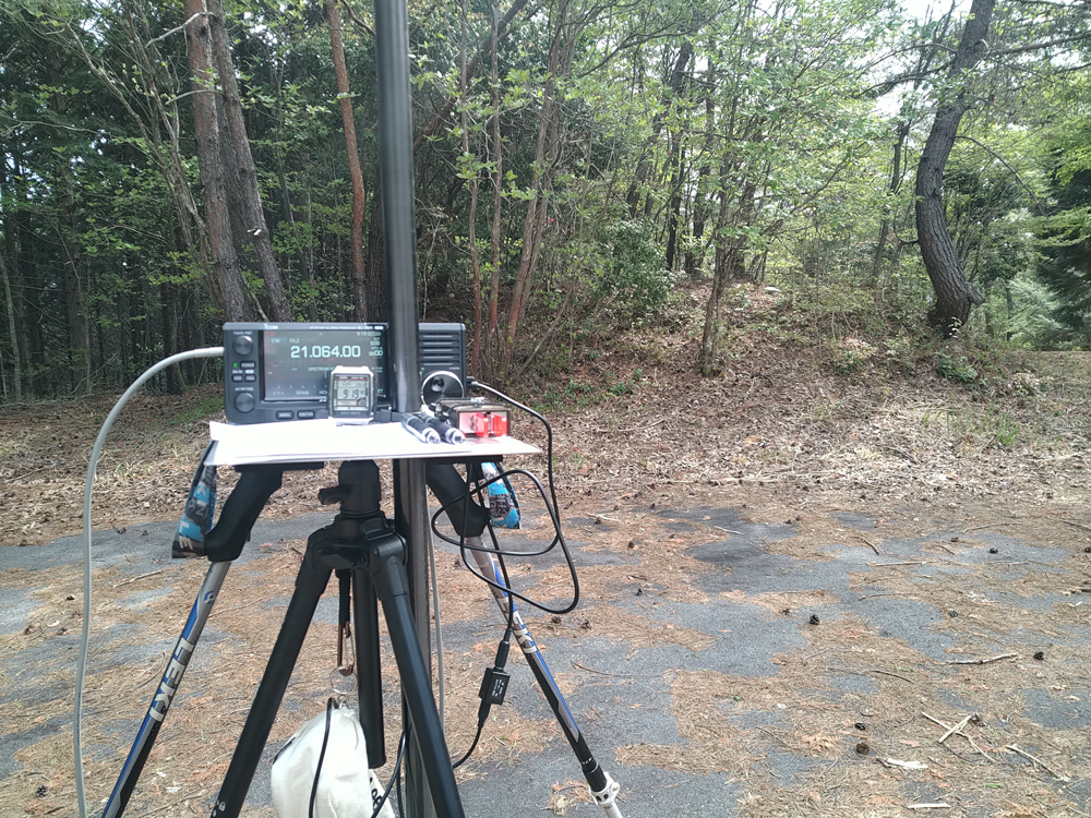 舗装路終了後は、林道を進まず、前回歩いた踏み跡を通り、歩行距離を短くしました。ほどなく山頂に到着。前回は山頂東側の広場で運用しましたが、今回は山頂近くのもう一つの広場でINV-V DPを張りました。コンディションは悪く、21、14、7、18MHzに電波を出しましたがどれもゼロではなかったものの数は多くありませんでした。