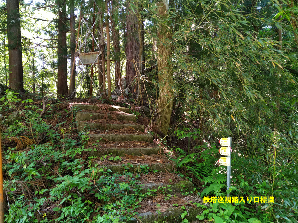 中央自動車道、無料の三遠南信自動車道、矢筈トンネルを使い聖岳に行った時を思い出しながら、道の駅に立ち寄り後入山口到着。そこには階段があり3箇所の送電鉄塔番号が書かれた標識が設置してありました。
